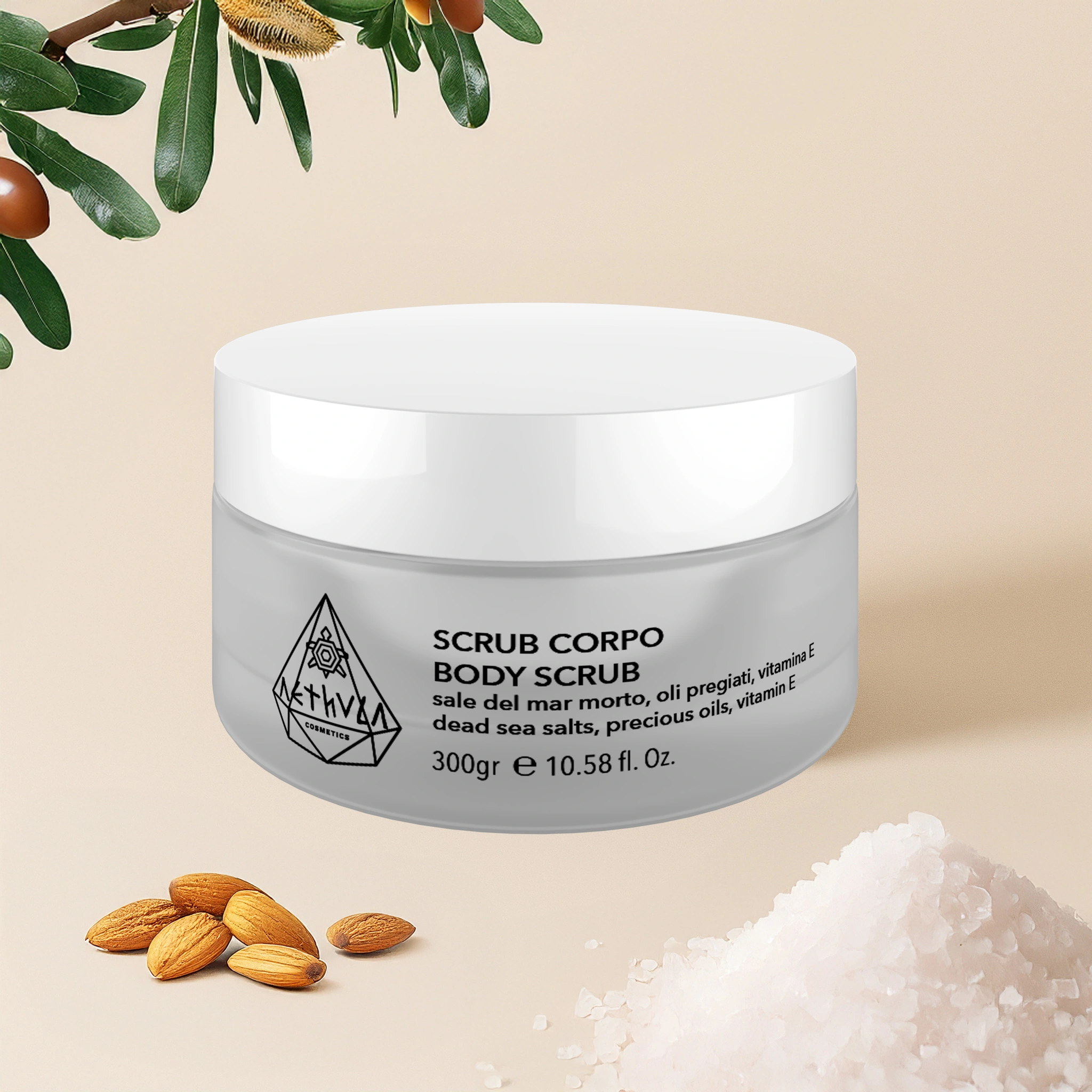 Un rituale di bellezza rigenerante con sali del Mar Morto e preziosi oli vegetali (Argan, Mandorle Dolci, Jojoba). Esfolia delicatamente, stimola il rinnovamento cellulare e nutre in profondità la pelle, lasciandola setosa, luminosa e rivitalizzata. Ideale per idratare tutto il corpo, elimina tossine e cellule morte, risvegliando la naturale vitalità della pelle. Formula naturale ad alta tollerabilità, per una bellezza autentica e sensoriale.